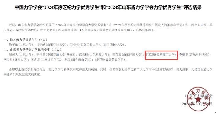 近日,山东省力学学会官网公布“2024年山东省力学学会力学优秀员工”获奖名单,公司beats365唯一官网入口官网工程力学专业首届本科生赵慜婧荣获该奖项。