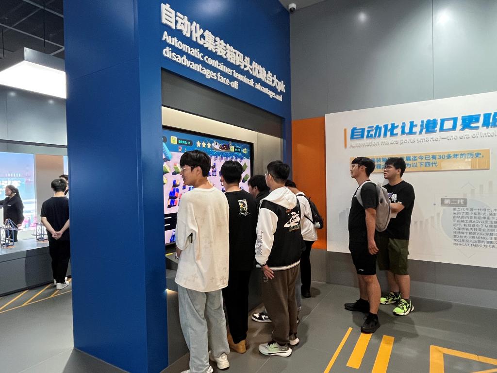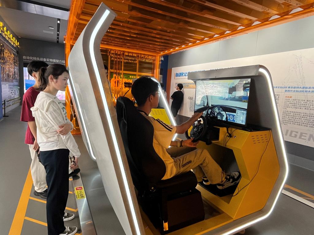 走进山东港口自动化码头工业研学基地,讲解老师带领员工们以智慧港口发展史为脉络,以新时代下港口工人对新科技新技术的探索和攻坚克难的创新精神和工匠精神为核心,通过叙事与多媒体互动,了解码头历史变革,传递新的港口文化与港口精神;通过VR体验、模拟驾驶舱以及沉浸式CAVE空间等先进的数字化设施,沉浸式体验海洋科技魅力,感受中国“智”造的意义。登顶天台,员工们观看了全自动化码头集装箱作业现场,观看无人驾驶导引车、自动化岸桥在5G与AI技术支持下的高效作业,深刻感受到全国首座“全国产全自主自动化”码头在研发建设领域所体现的“中国速度”和“工匠精神”。