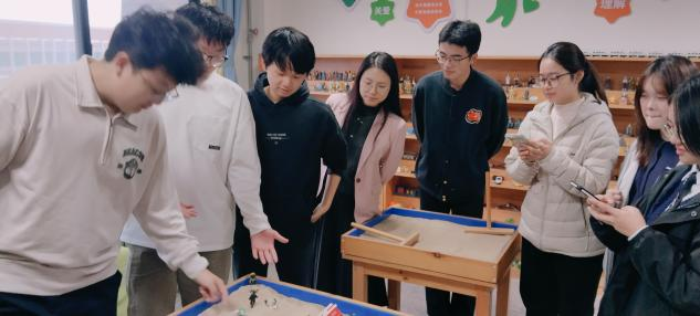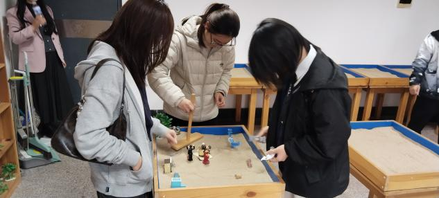 整个过程中,老师始终默默陪伴,不干预、不评判,现场氛围和谐轻松,同学们也在专注的创作里,悄然探索着自身的需求与困惑。待“沙盘世界”创作完成,同学们主动分享沙盘中的故事与想法,老师则适时引导大家解读沙具背后的深层意义。“用语言无法清晰描述的情绪和感觉,可以通过双手构建沙画以呈现内在的心灵世界。沙盘的创作、分享过程能帮助我们更深入的探索、了解自我,获得领悟与成长。”活动最后老师总结道。