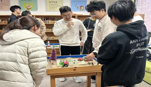 活动中,心韵社员工负责人张风瑞详细讲解沙盘使用规则,通过温和的引导营造安全放松的氛围,让同学们卸下心理负担,得以完全舒展自我。在创作环节,同学们自由挑选人物、动物、建筑等各类沙具,在沙盘中反复摆放、调整,共同构建专属于自己团队的“沙盘世界”,缓缓道出内心独白。